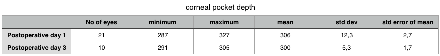 Die Schnittgenauigkeit und -qualität im Mikrometerbereich der PocketMaker Technologie in einer lebenden Hornhaut ist unerreicht. Die folgenden Daten zeigen das Ergebnis einer entsprechenden Studie am lebenden Auge in der Implantatchirurgie der Hornhaut anhand von OCT (Optical Coherence Tomography) Messungen bei einer vorgegebenen Schnitttiefe von 300 Mikrometer über eine Schnittfläche von 9 mm Durchmesser. Kein anderes chirurgisches System kann eine derartig hohe Schnittqualität und Wiederholgenauigkeit erreichen.